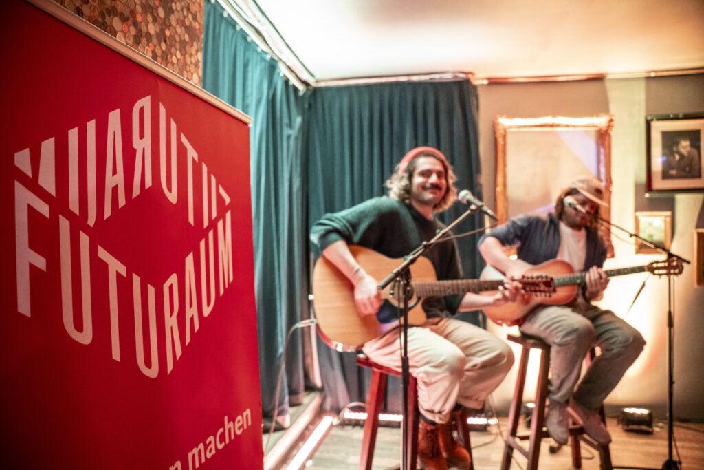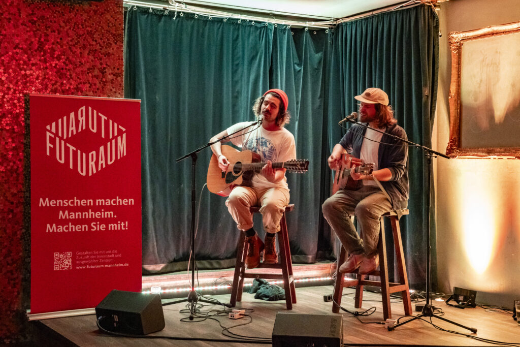 Die beiden Musiker Tom Woschitz und Phil Soddemann KALK¥Lim Nachtclub Chaplin überzeugten mit Stimme und Gitarrenklängen. Beide brachten ihre Songs in schnellen Rhythmen, die sich auch mit melancholischen Passagen abwechselten. Für die Veranstalter von Wirtschaftsförderung, FutuRaum und VTM war der Abend eine erste Erfahrung, abseits von öffentlichen Räumen jetzt im Herbst unter anderem in Clubräumen „Kultur im Quadrat“ anzubieten. Die Netzwerkarbeit wird wichtiger, weil die „Laufkundschaft“ entfällt.