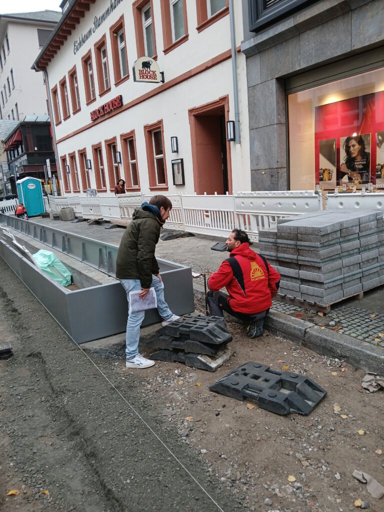 In Höhe P 5 der Fressgasse sind Vater Dominico Rapisarda und Sohn Vincenzo von der Firma Rapisarda mit dem Aushub des neuen Hochbeets beschäftigt, sie werden auch einen Teil der Baumscheiben entsiegeln und das Umfeld der Bäume mit Erde ausfüllen.
