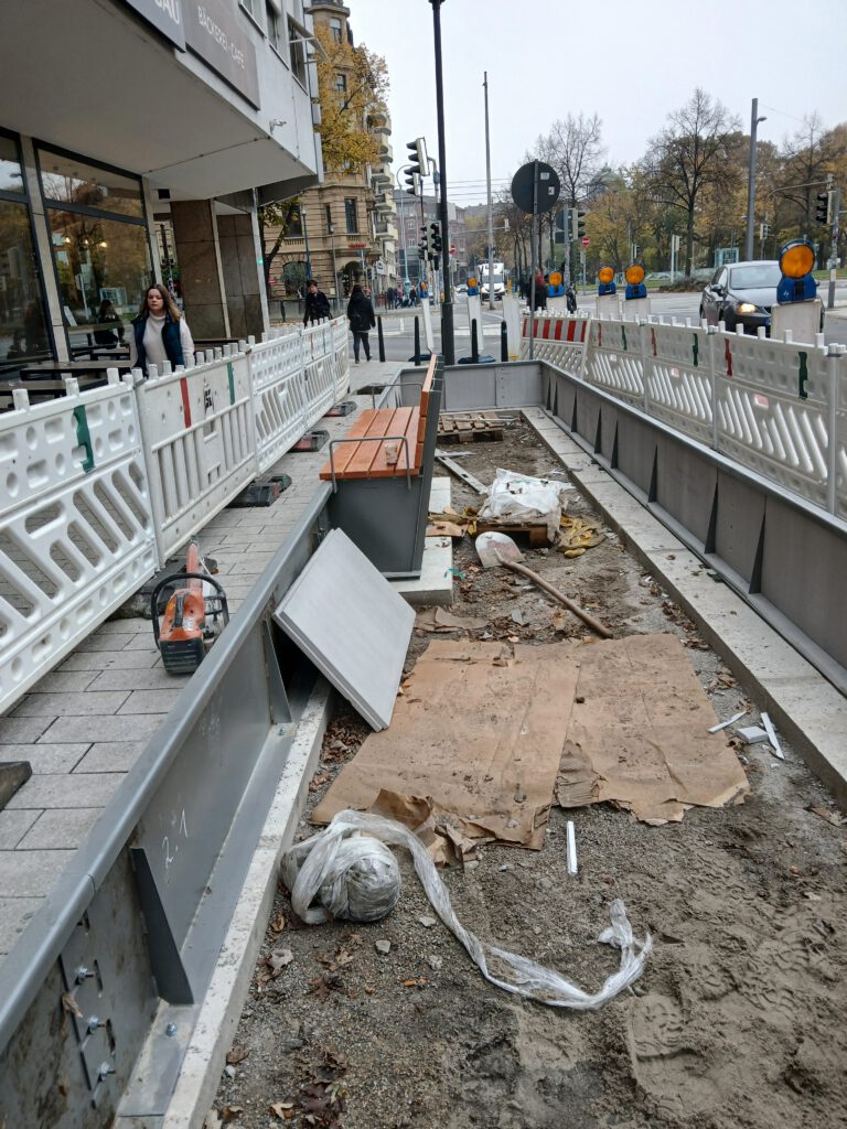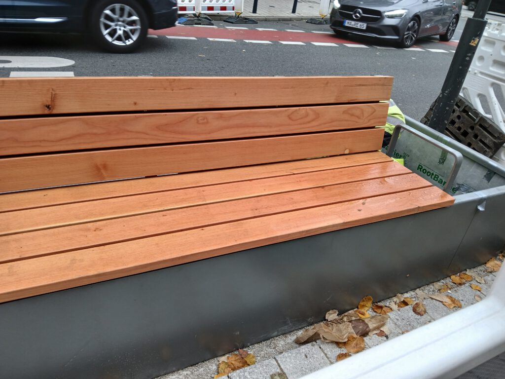 Die großen Würfe – so war angesichts der Haushaltslage schnell klar – sind unrealistisch. Gelungen ist eine Umsetzung in kleinen Schritten. Im April 2025 ergriffen die Einzelhändler der Fressgasse die Initiative und entschieden sich für schmucke Blumenkübel, die sie selbst vor den Geschäften aufstellten, bepflanzten und jetzt pflegen. Sie gehören inzwischen zum gewohnten Bild der Einkaufsstraße. Die Teil-Entsiegelung der Fressgasse war ein Ziel, das jetzt bis Ende November umgesetzt ist. Die Gelder kommen aus Bundes-Fördermitteln.