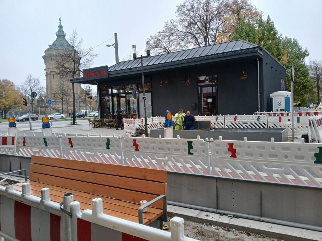 Im Eingangsbereich der Fressgasse werden derzeit zwei Hochbeete sowie ein Tiefbeet angelegt. Darüber hinaus erfolgt die Umwidmung von insgesamt vier Kurzzeitparkplätzen in P5 zugunsten zusätzlicher Begrünung. Die entsiegelten Flächen mit einer Gesamtgröße von rund 80 m² werden ökologisch hochwertig mit Sträuchern (u. a. Perückenstrauch), Stauden (z. B. Herbstanemone, Lavendel, Aster) sowie einem Zürgelbaum bepflanzt. Am Eingang der Fressgasse sind die Arbeiten fast fertig. „Wir haben alle Metallarbeiten übernommen, zum Beispiel für die Blumenrabatte-Rahmen oder für die Sitzbänke“, sagt Gaetano Tabone, Polier bei Diringer & Scheidel. Sax und Klee kümmert sich um die Fundamente, die Perimeterdämmung und die Bepflasterung im Umfeld der Blumenrabatte.