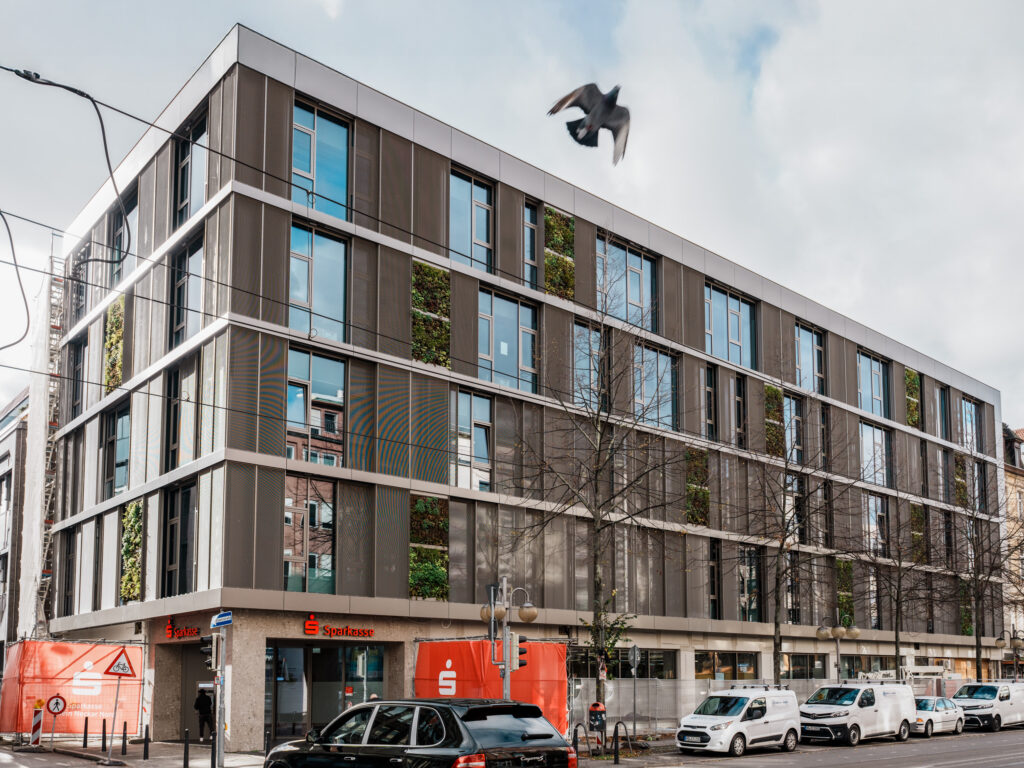 Im Mittelpunkt der Begrünung steht die innovative Fassadenbegrünung, die das Gebäude zu einem lebendigen Bestandteil des städtischen Klimasystems macht. Rund 300 Quadratmeter Fläche sind und werden begrünt, ein Beitrag, der in einer dicht bebauten Innenstadt wie Mannheim weit über das Gebäude hinauswirkt.
