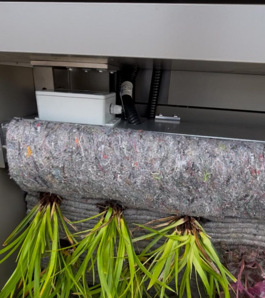 Die Pflanzen wachsen in modularen Kassetten, jeweils etwa 50 mal 50 Zentimeter groß, die sich zu größeren Flächen koppeln lassen. Gefüllt sind sie mit einem gefalteten Vlies, das die Setzlinge trägt und die Bewässerung steuert. Über eine obere Rinne wird das Vlies von einer smarten Bewässerungsanlage kontinuierlich mit Wasser versorgt. Es saugt die Feuchtigkeit selbstständig auf, speichert sie und gibt sie gleichmäßig an die Wurzeln ab. Überschüssiges Wasser tropft in eine untere Rinne, wird gesammelt und gezielt abgeleitet. Erde oder Substrat sind nicht erforderlich, die Pflanzen wachsen direkt im Vlies, ein System das leicht, wartungsarm und vollständig recyclebar ist.