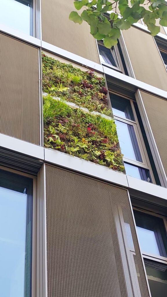 In den Hauptfassaden sind die Begrünungsmodulen verteilt angeordnet und erzeugen ein lebendiges, organisches Fassadenbild. Im Bereich der Fuge, die das Treppenhaus markiert, werden die Module flächig eingesetzt und bilden dort eine zusammenhängende grüne Fläche, die sich deutlich von der übrigen Fassadenstruktur absetzt.